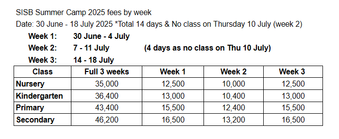 SISB의 체계적인 교육 시스템과 아이들의 흥미를 유발하는 다채로운 액티비티가 3주 동안 펼쳐집니다. 마치 우주를 탐험하는 듯한 즐거움 속에서 영어, 중국어, 태국어와 같은 언어 학습은 물론, 수학, PE, STEM & ICT, Art까지 다양한 과목을 경험하며 우리 아이의 잠재력을 깨울 수 있는 최고의 기회입니다! 🚀👽